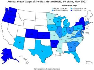 The following table shows the median annual salaries for medical dosimetrists in different states, according to the BLS: