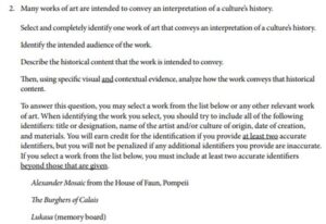 • Section III: Essay (20%): 1 essay question requiring a structured response of 450-500 words, analyzing and interpreting a pair of works of art.