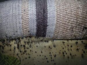 - Small, dark fecal stains on the mattress or bedding