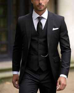 The dark color of a black suit has a slimming effect, making it a flattering choice for any body type. The fitted cut of the jacket and trousers accentuates the wearer’s silhouette, creating a sleek and polished appearance that exudes confidence.