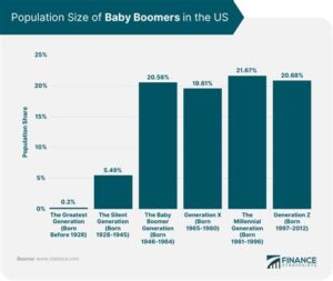 The baby boomer generation was born between 1946 and 1964. They are now reaching retirement age, and their numbers are starting to decline. By 2030, there will be more people over the age of 65 than under the age of 18.