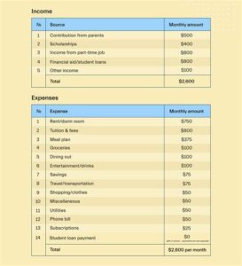 - Tuition and Fees: This is the largest expense for most college students. Determine the total cost of tuition, fees, and other academic expenses for the academic year and divide it by the number of months you’re in school.