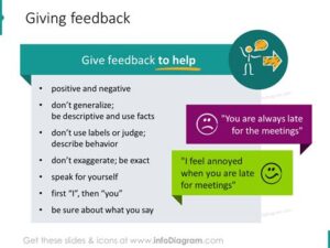 When providing feedback, be specific, constructive, timely, and respectful.