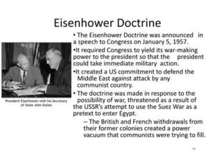 - 1957: President Eisenhower delivers his speech outlining the Eisenhower Doctrine.