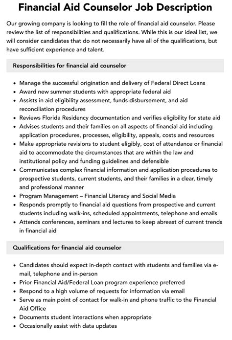 Financial aid counselors play an indispensable role in making higher education accessible to all students. Through their guidance and expertise, they empower students to pursue their academic goals, overcome financial barriers, and achieve their full potential. By understanding the responsibilities, qualifications, career outlook, and strategies involved in this profession, aspiring financial aid counselors can embark on a rewarding path where they can make a tangible impact on the lives of others.