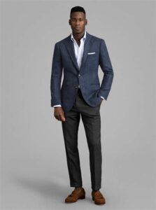 - The grey slacks-blue blazer pairing is suitable for a wide range of occasions, from boardroom meetings to social events.