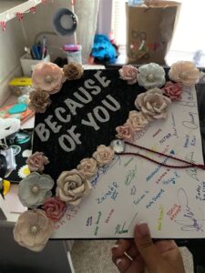 • A cap with the phrase “I did it for you” written in paint, with a photo of the graduate’s family in the background.