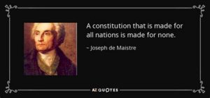 Maistre’s view is in contrast to the prevailing view of the time, which was that a written constitution was essential to protect individual rights and liberties. The United States Constitution, which was written in 1787, is a prime example of this view.