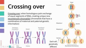 Crossing Over: During crossing over, homologous chromosomes exchange segments of DNA. This process shuffles genetic material, creating new combinations of alleles.