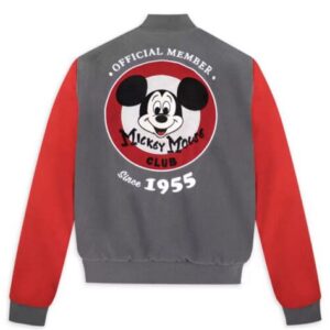 The iconic Mickey Mouse Club logo takes center stage on the chest, embroidered or printed with vibrant colors. The jacket often incorporates contrasting stripes, typically red and black or gray, which enhance its sporty appeal. Modern variations may include vintage-inspired patches or graphics, adding a touch of contemporary flair.