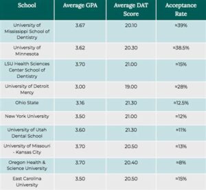 • Dental Admission Test (DAT): A competitive DAT score that demonstrates proficiency in scientific knowledge and critical thinking skills.