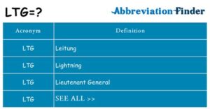 LTG is an acronym that can mean different things depending on the context in which it is used. The most common meanings of LTG are Lieutenant General, long-term goal, less than God, Local Time Greenwich, and Light Transmitting Glass.