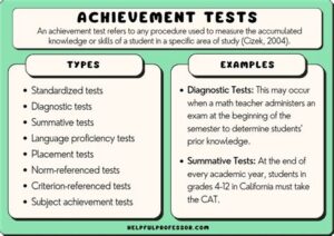An achievement test is a standardized exam that measures a student’s knowledge and skills in a specific subject area, such as math, reading, or science. Achievement tests are typically used to assess student progress over time and to compare student performance to national or state standards.